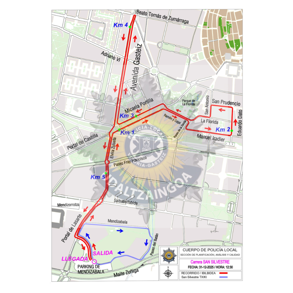 RECORRIDO – SALIDA/IRTEERA: Parking Mendizabala – C/Portal de Lasarte – C/Elvira Zulueta -C/Portal de Castilla – C/ Ramón y Cajal – C/ Paseo de la Senda – C/ Manuel Iradier – C/ Dato – C/ San Prudencio – C/ San Antonio – C/ Florida – C/ Ramón y Cajal – C/ Micaela Portilla – Avda Gasteiz – Giro 180º en cruce calle Beato Tomás de Zumarraga – Avda Gasteiz – C/ Elvira Zulueta – C/ Portal de Lasarte – Parking de Mendizabala- META-HELMUGA Parking de Mendizabala.